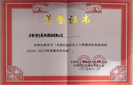Hefei Huasheng Bombas y válvulas Co., Ltd.Recientemente ha sido galardonado con el “Mejor proveedor”honor por el Red Nacional de Bombas de Ingeniería Química y Petrolera para el período 2024-2025. Este reconocimiento refleja la sólida experiencia técnica de la empresa, la calidad confiable de sus productos y el excelente servicio en el campo de los equipos de fluidos para las industrias petrolera y química.